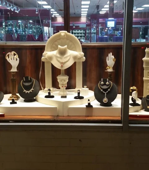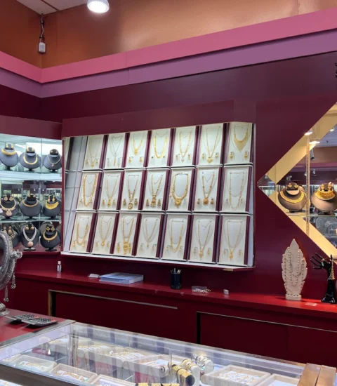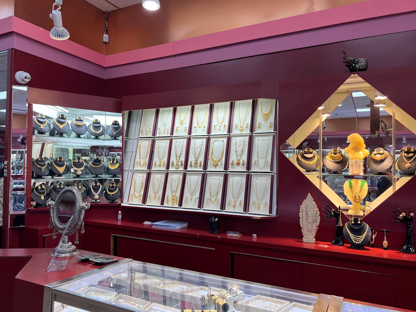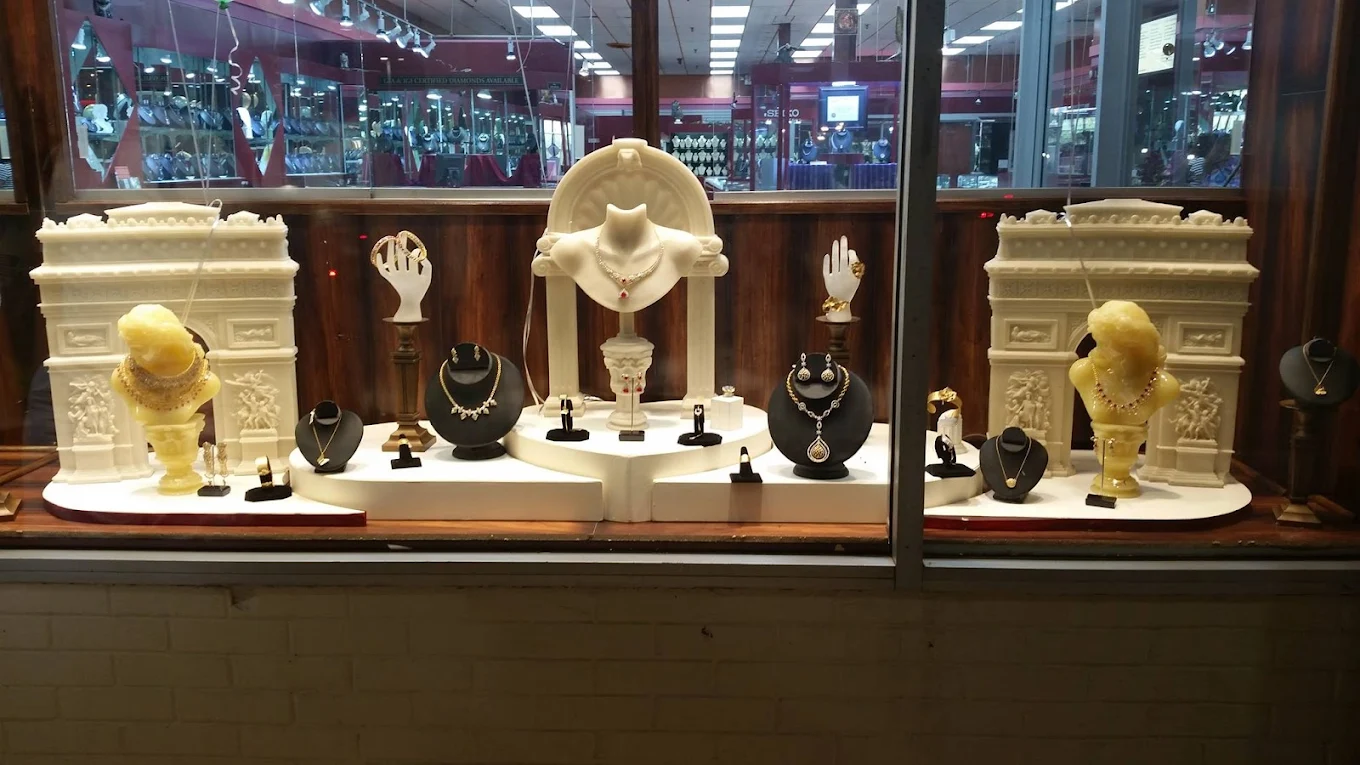 Unassuming jewelry store with many Indian styles like gold rakhi and silver religious idols.